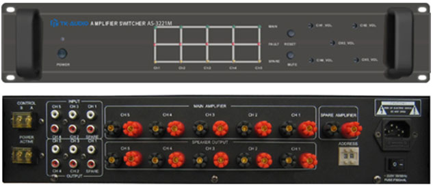 AS-3221M是一款进行系统备份的设备切换器,可以实现多对一的备份功能,可接5台主功放1台备用功放,当主功放发生故障时,可以自动切换到备用功放,保证系统的正常工作。