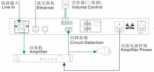 3.音频线路输出,接外部功放扩音(带回路检测,可监听);