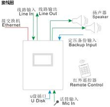 6. 可选配U盘播放、无线话筒模块、定压备份广播(接入100V定压广播线路作为备用,符合教委重要考试必须有备用系统,双路同时工作的要求)