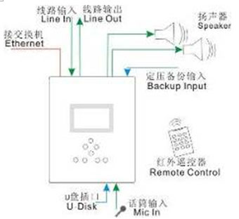 6.本地扩音(带线路输入和话筒输入),电脑可通过终端扩音输出,有三级优先:网络音频>本地话筒>本地线路输入